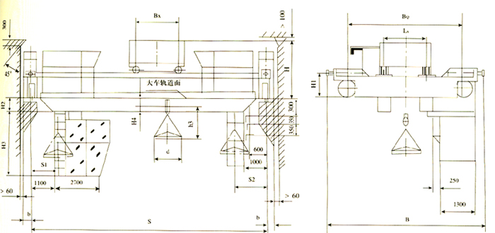 本機由箱形橋架。大車運行機構、小車、電氣設備、電磁盤五部分組成,全部機構均在操縱室內操縱,當露天使用時帶有防雨設備。
